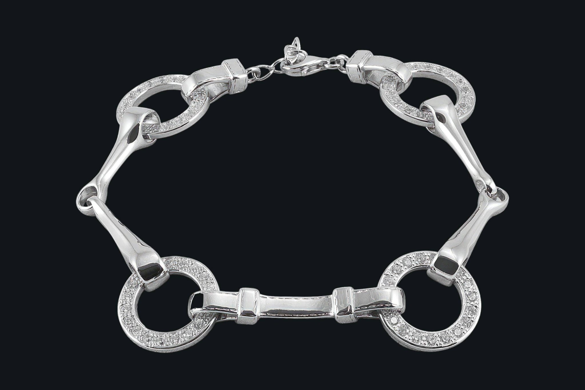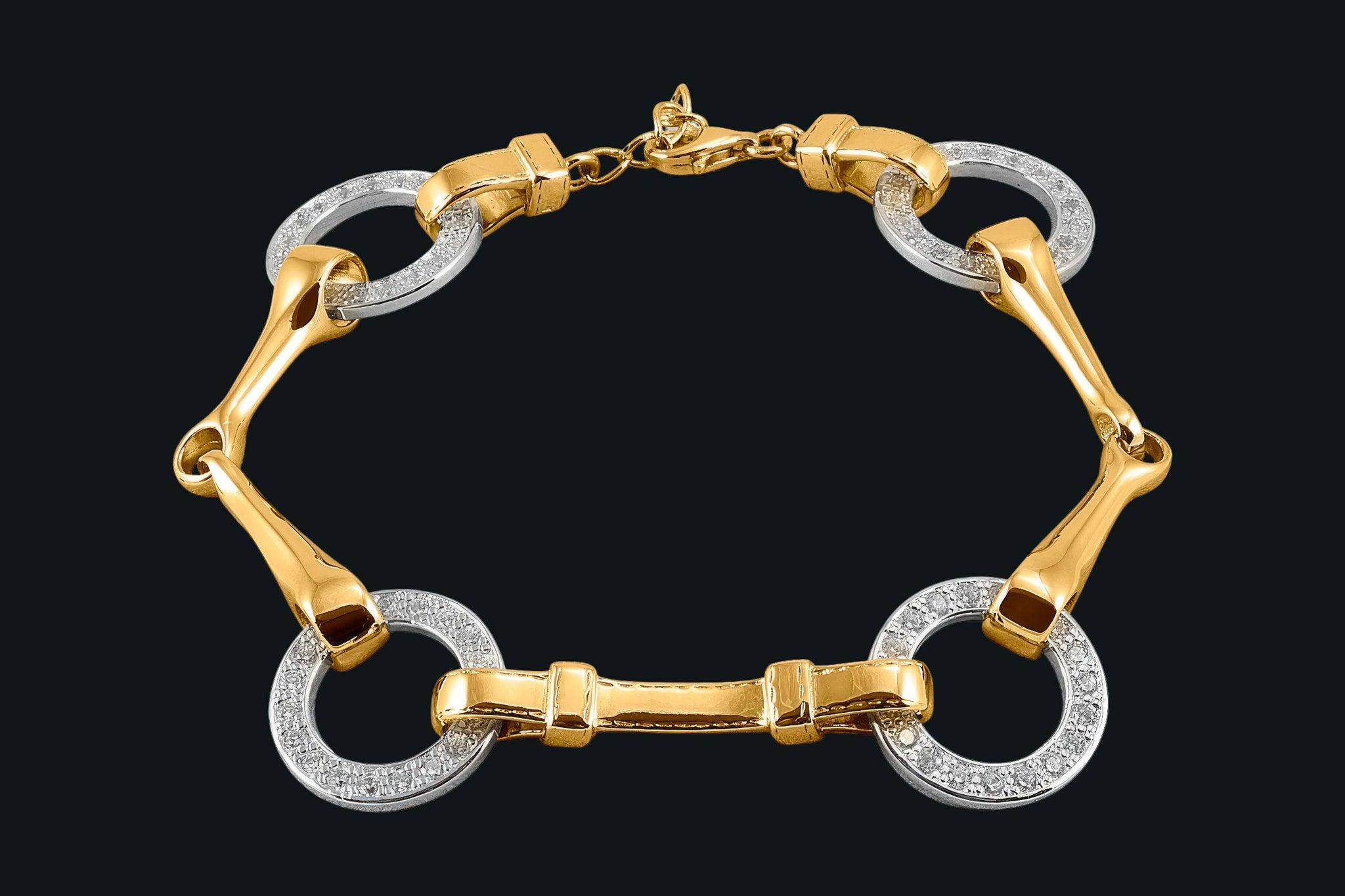 This bracelet features a snaffle bit design and is made of 14K gold, making it a luxurious and stylish addition to your jewelry collection. Made of 14k yellow gold with white gold and pavé diamonds, or all white gold with diamonds.