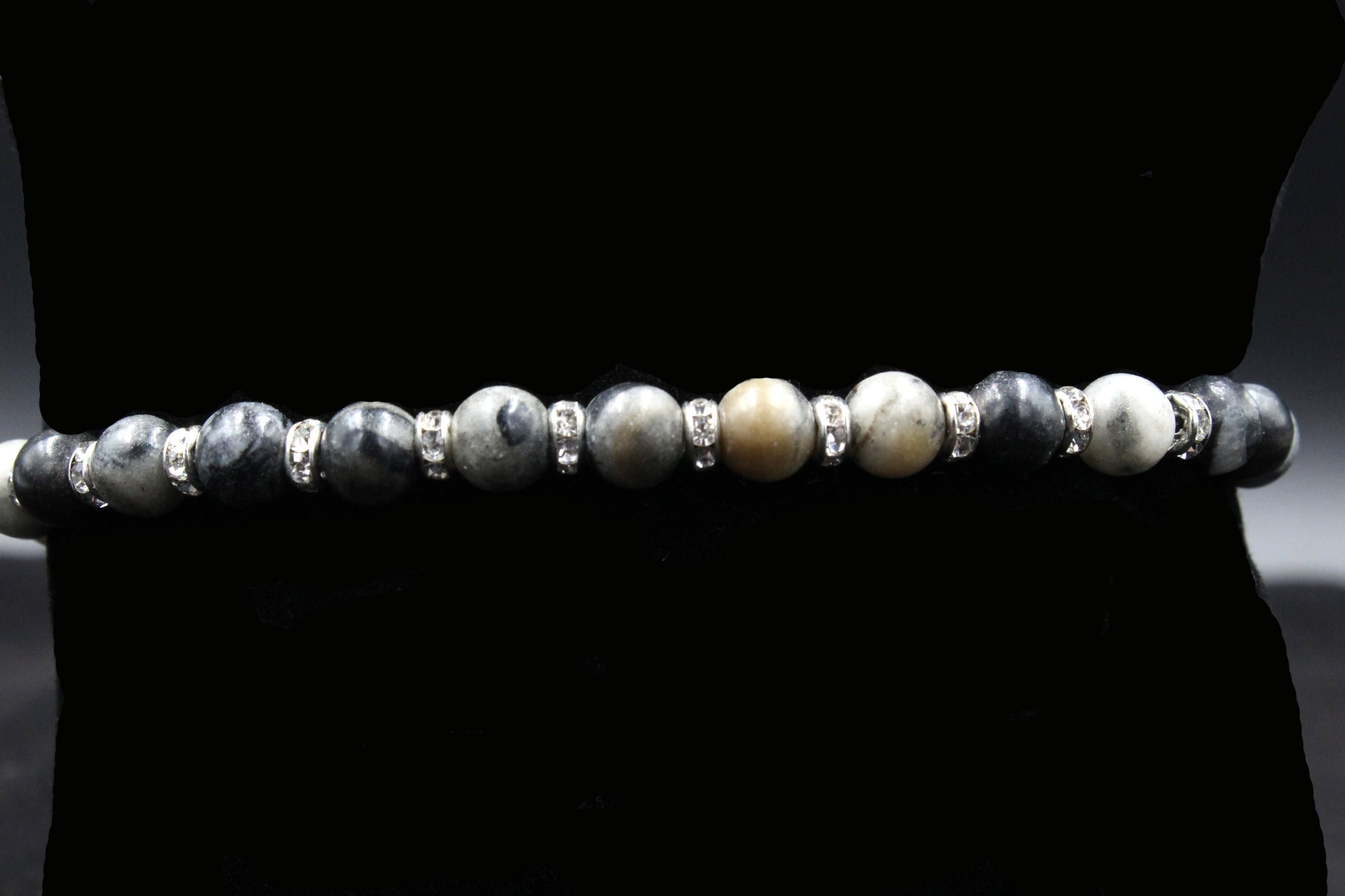 Agate Stripped Black Matte Round Beads With A Fun Dangling Grey Cubic Zirconia Crystal On Each End. Silver Plated Clasp