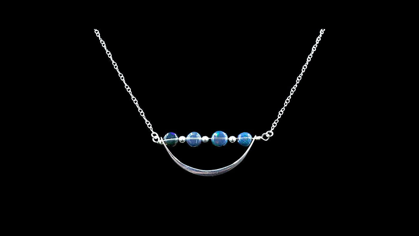Simple, elegant, and effortlessly radiant—this Sterling Silver Necklace features polished half crescent silver beads accented with luminous blue opal and silver details. The soft fire and shifting hues of the opal bring a delicate touch of color and light to this minimal yet striking design.
